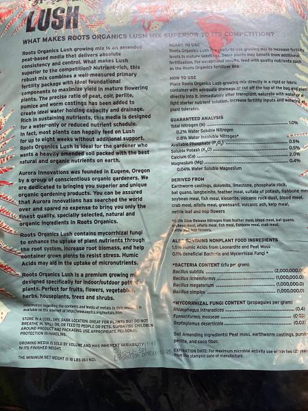 Roots Organics Lush is a ready-to-use growing mix to increase fertility levels in mature seedlings. Some plants may benefit from additional fertilization. For exceptional results, feed with quality nutrients such as the Roots Organics fertilizer line.
