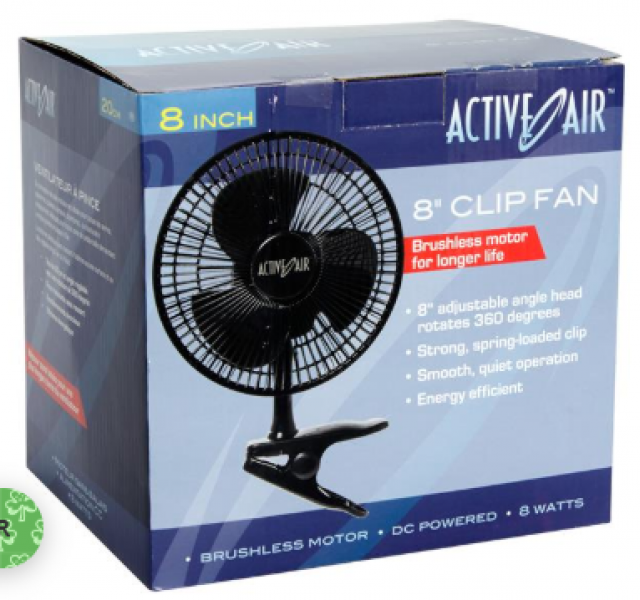 Active Air 8" Clip Fan, 7.5W 7.5W brushless motor for longer life Energy efficient, low voltage Ultra quiet operation Great for small gardens Clips to flood tables for air flow under foliage