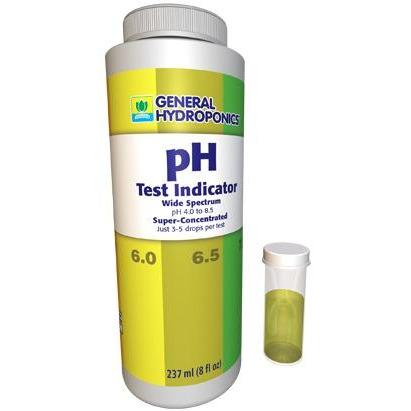 General Hydroponics® pH Test Kits make pH testing easy. Simply fill a test-tube halfway with nutrient, add a few drops of pH Test Indicator and observe the coloration of the liquid in the test vial. Many experienced growers prefer our pH Test Kit to expensive electronic meters because of its reliability and ease of use, which are important factors when the health of a valuable crop is at stake. Use 3 drops per 5 ml of solution.