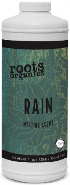 GUARANTEED ANALYSIS Active Ingredient: Yucca schidigera extract (wetting agent) 80.0% Active Ingredient: Quillaja saponaria extract (wetting agent) 16.0% Inert Ingredient: Aloe vera extract 4.0% Roots Organics Rain promotes water penetration and aids in the dispersion of foliar applications. A combination of the natural wetting agents yucca and quillaja, this product reduces water surface tension and enhances the movement of solutions and soluble nutrients throughout the rhizosphere. By reducing surface tension and increasing the leaf surface to active fertilizer or control, Roots Organics Rain enhances the effectiveness of foliar-applied agents. Use this product to assist water infiltration, increase volumetric moisture content of media, reduce evaporative water loss, improve irrigation efficiency, and equalize the osmotic differential in soil and soilless media by mediating more uniform moisture distribution. A powerful gardening tool, Roots Organics Rain is designed for both foliar and root zone application. AVAILABLE IN 1QT / 1GAL / 2.5GAL / 5GAL COMMERCIAL SIZES 15GAL / 55GAL / 265GAL APPLICATION RATE Foliar Adjuvant Add 1 - 3 tsp per gallon (5 - 15 ml) to your final spray solution. Apply to foliage just before the lights are turned off and allow plants to dry before lights are turned on. Do not apply during final weeks of flower. Container Gardening Add 1/2 tsp - 1 tsp per gallon (2.5 - 5 ml) to fertilizer solution. If media is difficult to wet, then add a small amount of fertilizer solution to each container and return in 15 minutes to add the rest. Use with any fertilizer program or water to enhance solution dispersion. Vegetable Gardens and Flower Beds Add 5 – 7.5 TBS per 10 gallon (75 - 110 ml) to fertilizer solution. R