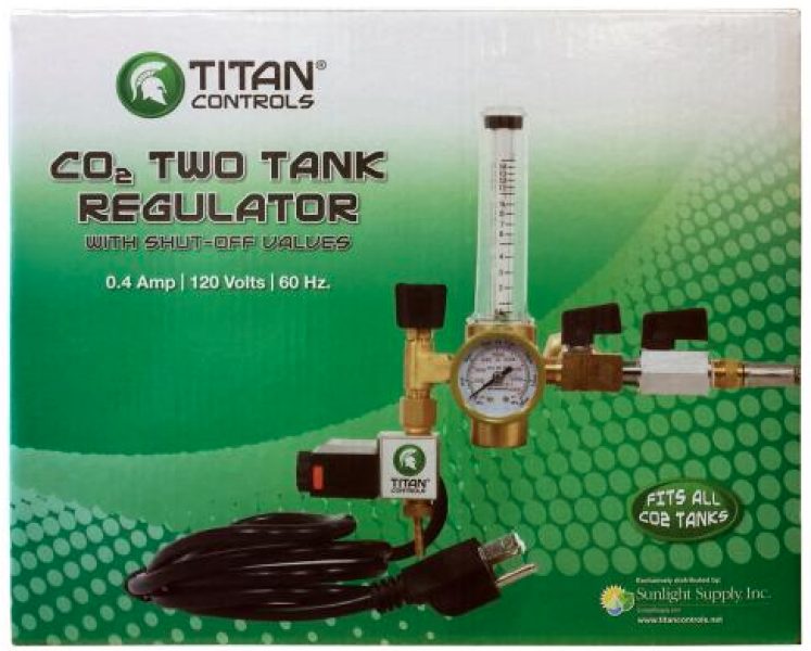 Tired of having to constantly change out your CO2 tanks? With the Titan Controls® Two Tank Regulator, you're now able to go twice as long before having to switch out your tanks. This device gives you the flexibility to run two tanks in sequence (one after the other) or to run two tanks simultaneously. It features a precise flow meter that allows you to tune it from 0.5 to 15 SCF/Hour (standard cubic ft per hour). This unit is built to last with a heavy-duty brass body, high-quality valves and a steel braided hose. 1 Amp/120 V/ 60 Hz.